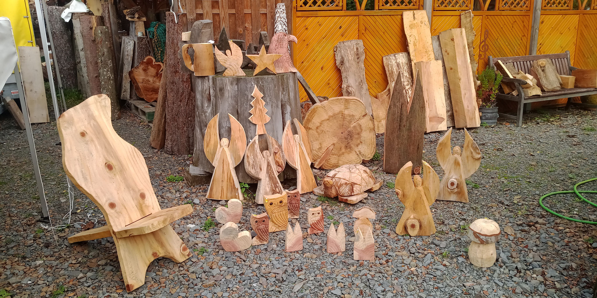Vor der neuen Werkstatt entstehen in atemberaubender Geschwindigkeit kettengesägte Unikate aus heimischen Hölzern